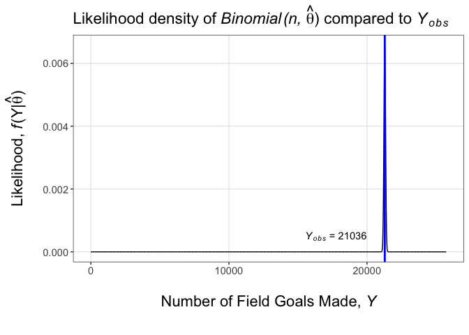 To verify the selected likelihood $Y|\theta \sim Binomial(n, \theta)$ is appropriate for the data, we will compare the PMF of the likelihood with the observed data $Y_{obs} = 21287$. The parameters of the likelihood were set to $n = 25732$ and $\theta = \hat{\theta} = Y/n$ to represent the sample proportion. The fit likelihood PMF has highest probability at $Y = Y_{obs}$ with very small variance when considering all possible values of $Y$ which is closely representative of the observed data. The likelihood is appropriate.