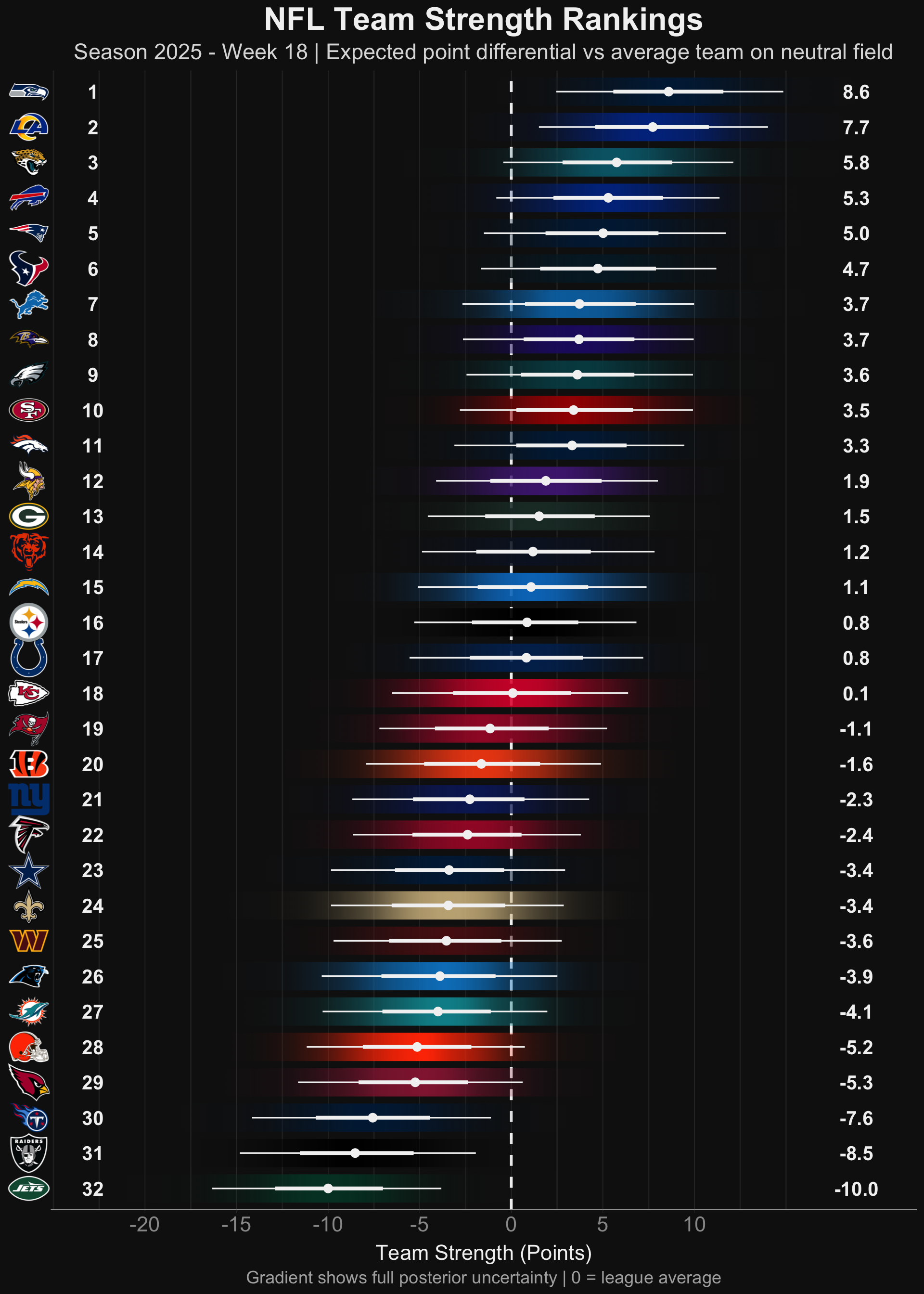This report provides weekly updates on NFL team strength estimates, home field advantage, and game predictions using Bayesian state-space models.