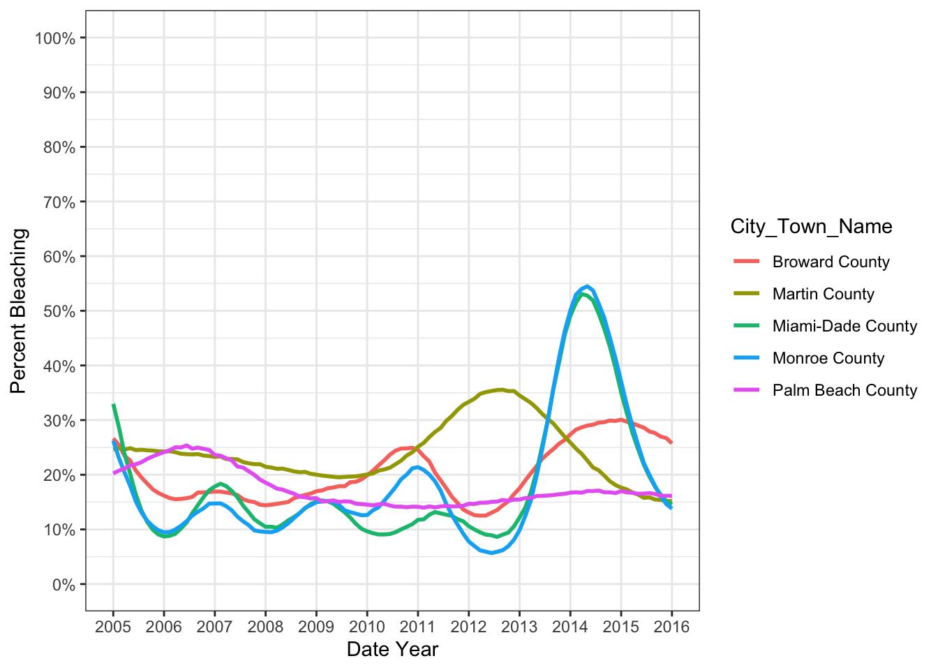 Monroe and Miami-Dade Counties stand out with the most extreme bleaching peak in 2014-2015.