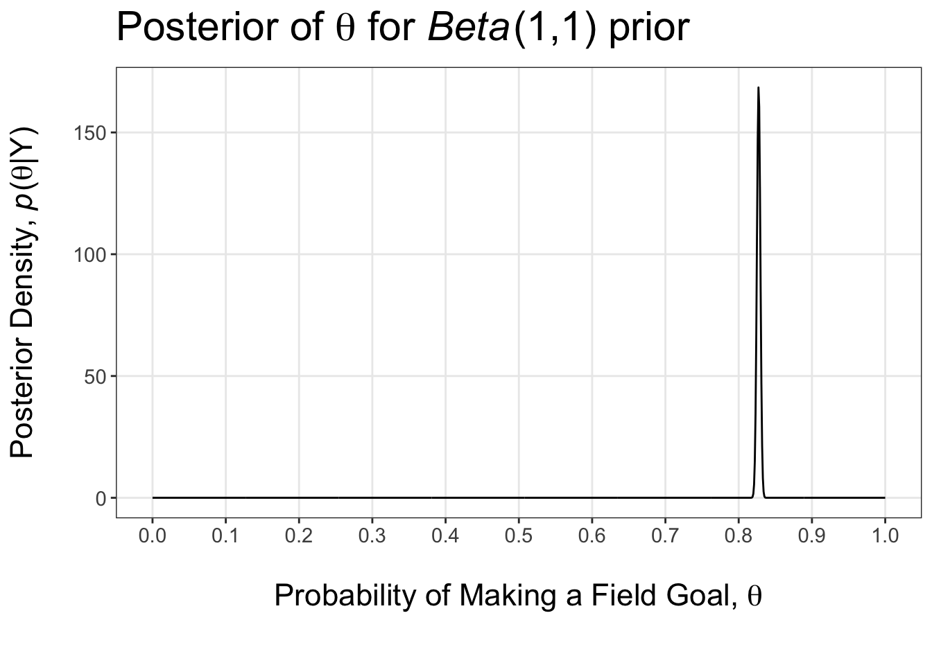 A plot of the posterior distribution for probability of making a field goal with the prior \(\theta \sim Beta(1,1)\) is plotted below.
